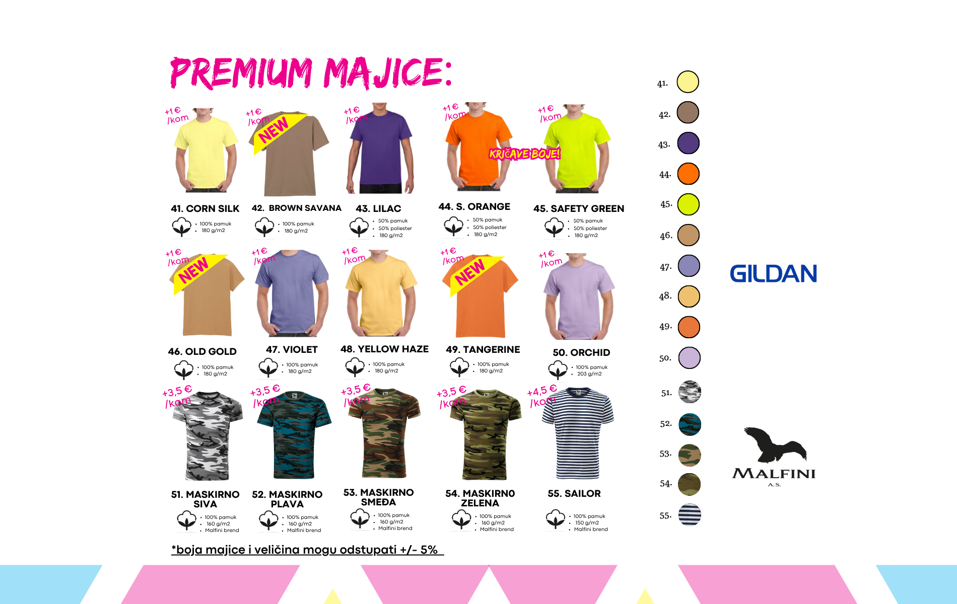 Uz standardne boje, nudimo i ekskluzivne premium nijanse i posebne maskirne i mornarske majice. Također, u ponudi su kričavo žuta i narančasta boja – savršene za one koji žele biti u centru pažnje!